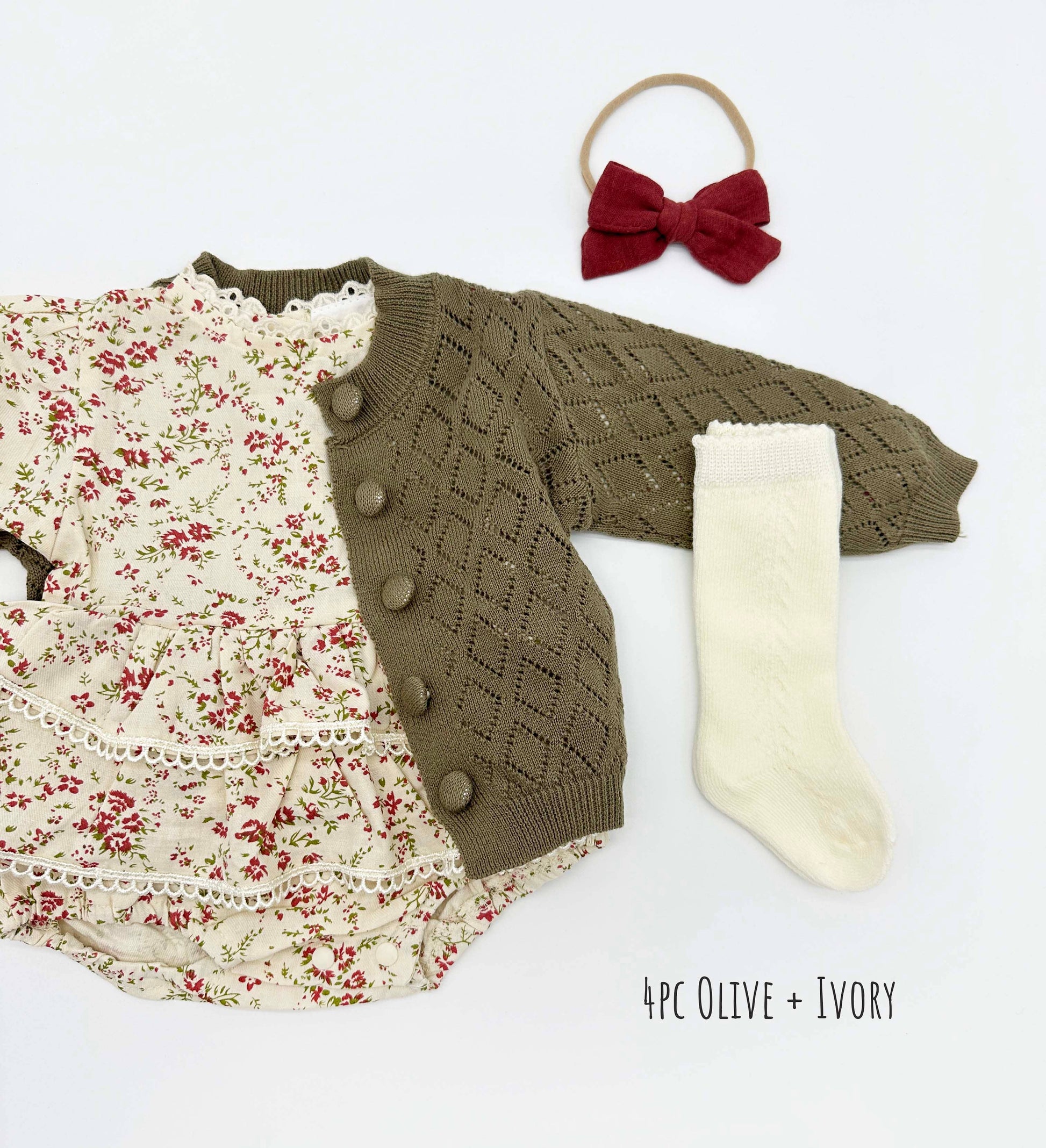 Included: Romper + matching bow headband (socks & cardigan optional)